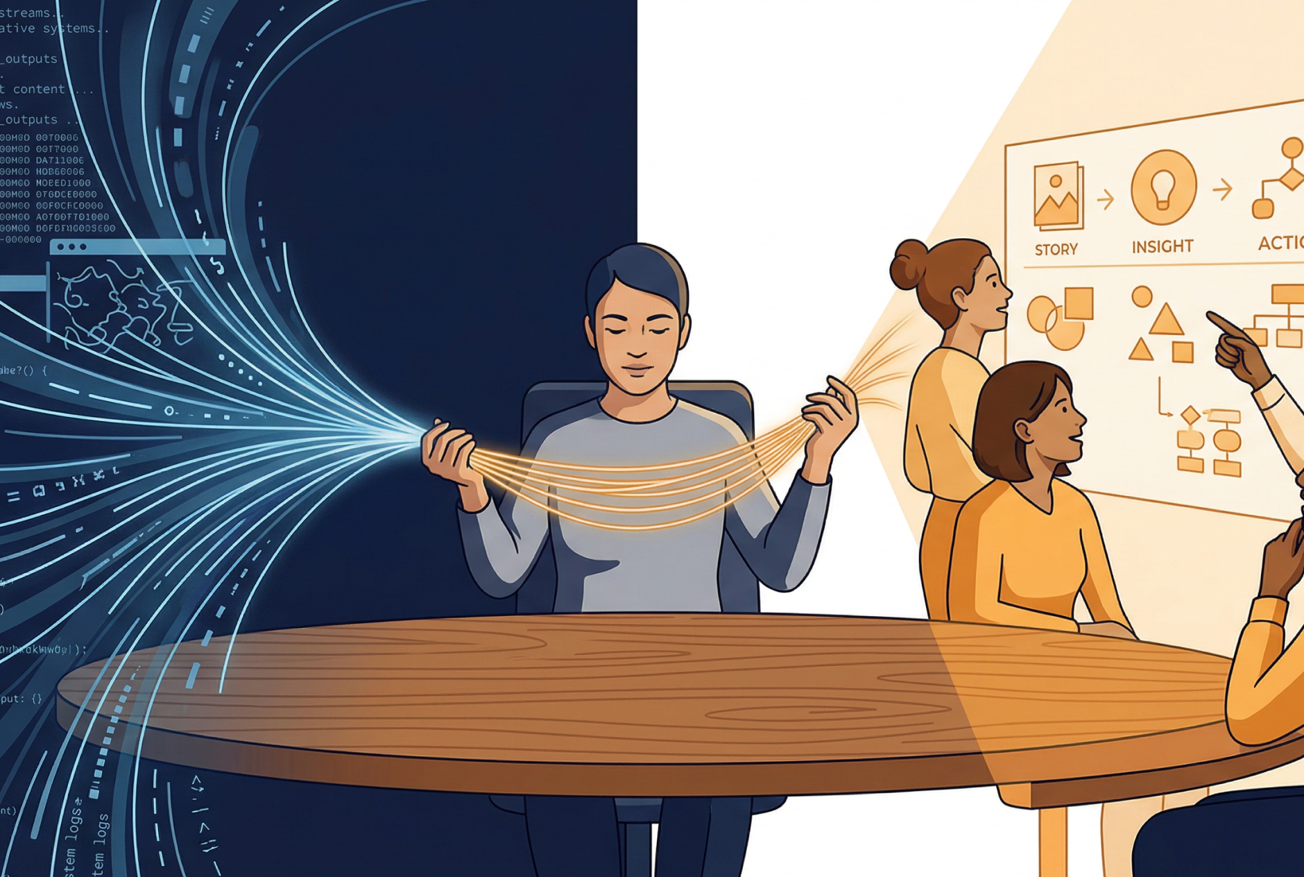 This is where designers have an opportunity that didn't exist at this scale before. Not because other functions are falling short, but because other functions were built for different problems. Data teams are excellent at explaining what systems do. Product teams are excellent at prioritizing what to build next. What is emerging as valuable is the layer that connects those two things: the narrative that says, here is what the system did, here is what users experienced as a result, and here is what the alignment between those two things is creating for us.